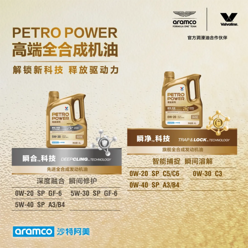 同時,為適應(yīng)不同車型和車主的使用需求,此次新品系列專門設(shè)計了奢金系列和鉑金系列等多種產(chǎn)品方案。PETROPOWER旗艦全合成機油(奢金系列)是該系列專為高端車型用戶打造的奢選養(yǎng)護方案,其中蘊含的瞬凈科技(TRAP & LOCK) 可幫助快速溶解與中和發(fā)動機運轉(zhuǎn)過程中產(chǎn)生的有害雜質(zhì),助力發(fā)動機擁有更高性能表現(xiàn),致力于使車主用戶享受到原廠等級和高端科技加持的悉心養(yǎng)護。鉑金系列則更適合總行駛里程數(shù)和車齡較高的高端用戶,其應(yīng)用的瞬合科技(DEEP CLING) 能夠使保護油膜牢固吸附并快速保護發(fā)動機零件表面,從而延長車輛的壽命。